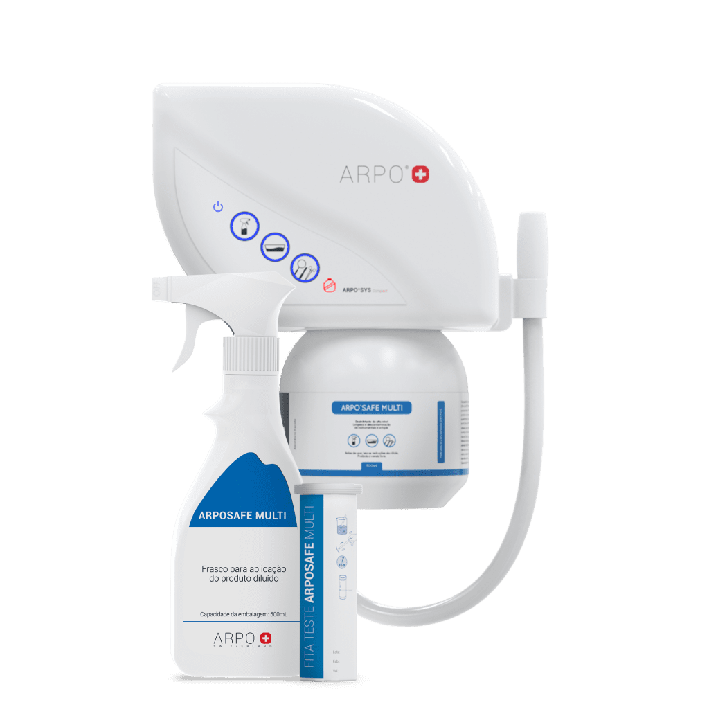 ARPO®SYS Compact é um sistema Gerador de Produto Pronto Uso (SGPU®) que gera, de forma precisa, diferentes soluções a partir de um concentrado químico, de exclusiva composição: Tecnologia Triamina + Tensoativos de Última Geração. Um sistema compacto e completo, desenvolvido na medida ideal para consultório odontológicos e clínicas. ARPO®SAFE MULTI é um Desinfetante de Alto Nível que possui exclusiva e inovadora composição com atividade antimicrobiana associada à tensoativos de última geração, possibilitando amplo uso e versatilidade Livre de aldeídos ou cloro, a composição de ARPO®SAFE MULTI não é volátil, sendo assim um produto de baixa toxicidade. Altamente compatível com instrumentais e artigos (PPS – produtos para saúde), mesmo os mais delicados, metálicos, sintéticos ou óticas.